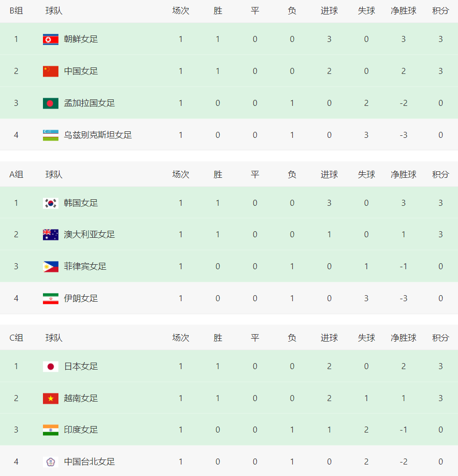 随着C组两场比赛踢完,2026年女足亚洲杯小组赛首轮全部结束,六场比赛全部分出胜负,并且取胜的球队都是第一档或者第二档,包括韩国队、澳大利亚队、朝鲜队、中国队、日本队、越南队,没有出现冷门比赛,强弱格局依然分明。